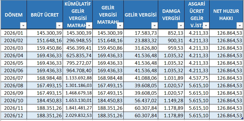yıl boyunca net tutarın mümkün olduğunca istikrarlı kalması ve vergi dilimi geçişlerinin kontrollü şekilde yönetilmesidir. Bu nedenle hesaplamaların aylık bazda yapılması ve kümülatif matrahın düzenli olarak izlenmesi önemlidir. 2026 yılı için yapılan çalışmalarda bu yaklaşım, net tutarın korunmasında belirleyici olmaktadır.